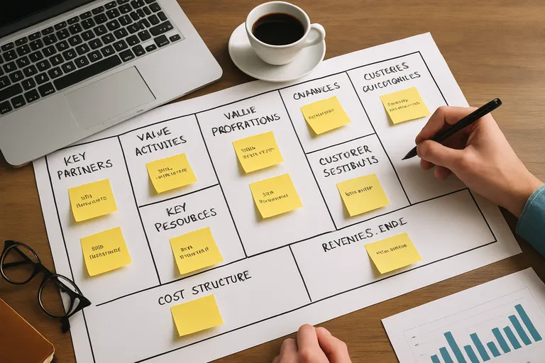 Start met klantsegmenten en waardepropositie: definieer jobs-to-be-done, pijnpunten en gewenste resultaten. Formuleer hypotheses per bouwsteen op post-its, schets kanalen en relaties, schat inkomsten/kosten globaal, valideer risicovolle aannames met klantinterviews en experimenten.